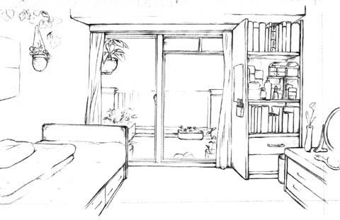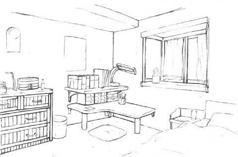 窓のある部屋。 わかりにくいですが、ビーズアクセサリーを作るのが好きな女の子の部屋。